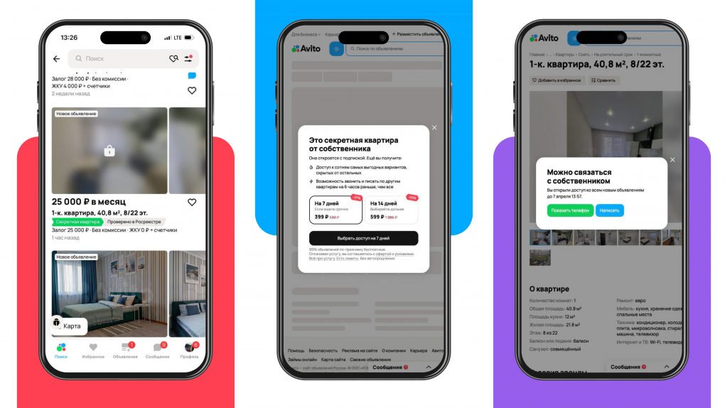 В свою очередь арендодатели получают обращения только от наиболее заинтересованных пользователей и могут быстрее закрыть сделку. Объявления могут быть скрыты на срок до 3 дней, после чего возвращаются в общую выдачу. Авито Недвижимость запустила функцию «Секретные объявления» для объявлений о сдаче жилья в долгосрочную аренду. Для пользователей платформы, арендаторов, это возможность получить гарантированный приоритетный доступ к объявлениям от собственников жилья без дополнительной комиссии посреднику. По данным платформы, средняя комиссия на рынке долгосрочной аренды составляет 50–100 % от месячной ставки — в среднем по России это от 12 тыс. рублей и выше в зависимости от города. Возможность просмотра полной информации и фотографий объекта в «Секретных объявлениях» есть только у арендаторов, которые оформили доступ. Остальным будет доступна ограниченная информация, например — цена аренды, число комнат, площадь, адрес и расстояние до ближайшего метро. В подписку арендатора входит прио