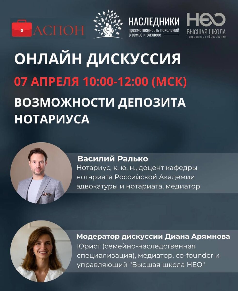 ) Поговорим с нотариусом Василием Ралько о том, какие возможности нам дает депозит нотариуса, чтобы эффективно использовать этот инструмент в пользу наших доверителей. ✔️Как вносить на депозит денежные средства при просрочке со стороны кредитора (смерть кредитора, процедура банкротства, намеренное уклонение от принятия исполнения); ✔️Нотариальное депонирование (эскроу счета) при сделках с недвижимостью, долями в ООО, акциями и др.; ✔️Что можно депонировать и идет ли речь только о денежных средствах (криптовалюта, вещи)? ✔️Стоимость нотариальных тарифов. 📆Дата: 07 апреля 2026 года (с 10:00 до 12:00) 🔗Регистрация по ссылке: https://vsneo.ru/vebinary-i-diskussii/vozmozhnosti-depozita-notariusa?gcpc=22af5 🪙Стоимость участия в дискуссии: 4900 рублей Спикер: Василий Ралько, нотариус, к.ю.н., доцент кафедры нотариата Российской Академии адвокатуры и нотариата. Модератор: Диана Арямнова, юрист по семейному и наследственному праву, медиатор, руководитель Высшая школа НЕО. Запись д