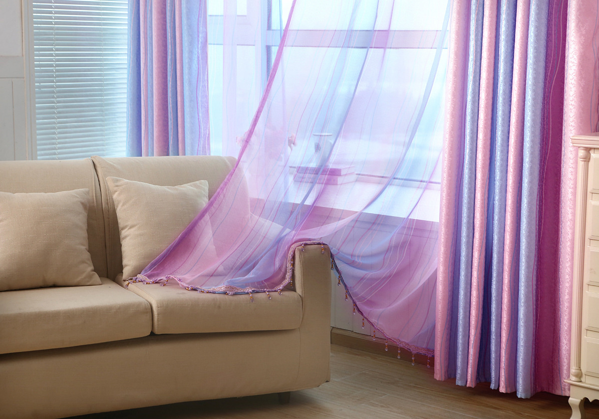 Цветной тюль в интерьере представлен разными видами тканей. Каждая из них имеет свои особенности — текстуру, степень прозрачности, способ плетения и т.д.