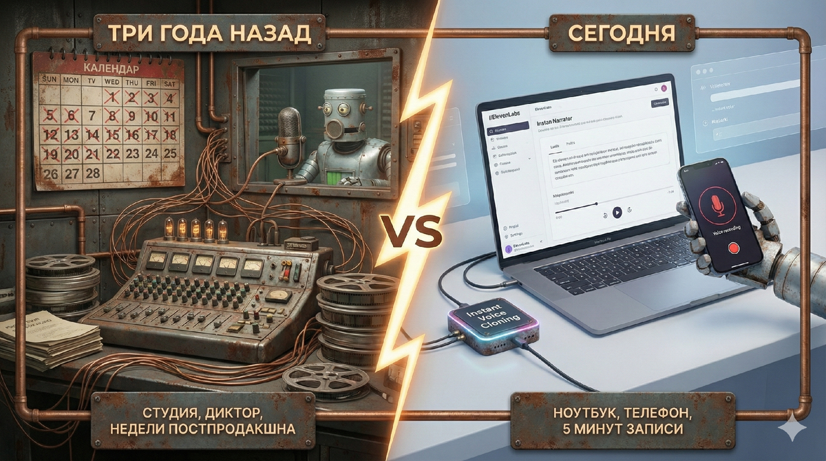 Ещё три года назад запустить собственный подкаст или аудиокнигу означало арендовать студию, нанять диктора и потратить несколько недель на постпродакшн. Сегодня вся эта цепочка сжалась до ноутбука и пяти минут записи голоса на телефон.
