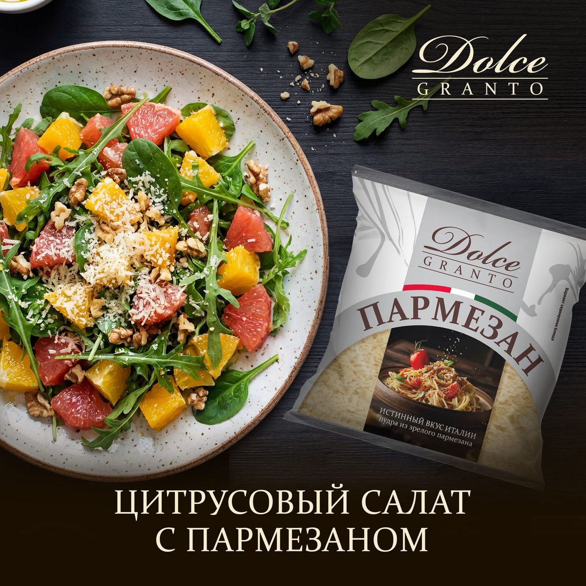 Иногда хочется блюдо, которое одновременно легкое, красивое и вкусное. И чтобы оно пахло солнцем, даже если за окном февраль. Такой салат существует — это цитрусовый салат с пармезаном Dolce Granto Platinum. Яркий, свежий, с нежной сырной ноткой, которая раскрывает вкус фруктов и придает блюду особый шарм. Выдержанный, плотный и ароматный пармезан Dolce Granto Platinum — это не просто украшение. Он добавляет тонкую фруктовую сладость, делает текстуру салата интереснее за счет легкого похрустывания и связывает вкусы фруктов и зелени воедино. Даже маленькая горсть сыра превращает салат в настоящее гастрономическое удовольствие. Ингредиенты: Пармезан делает салат не просто свежим, а объёмным по вкусу. Его фруктово-ореховая сладость и легкая солоноватость раскрывает кислинку цитрусовых, создавая баланс, который приятно удивляет. Этот салат идеально подходит для лёгкого ужина или как яркая закуска на праздничный стол. И даже зимой он напоминает о солнце, свежести и лёгкости, а ещё о том, ка
