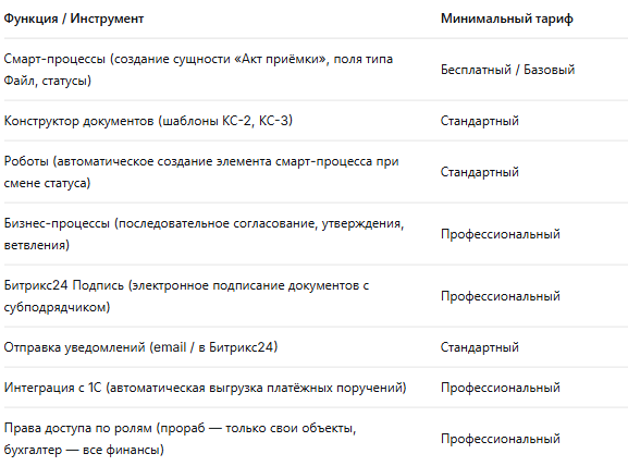 Акты КС-2 и КС-3, содержащие данные о контрагентах и стоимости работ, являются первичными учётными документами. Доступ к смарт-процессу «Акт приёмки работ» должен быть строго ограничен по ролям: