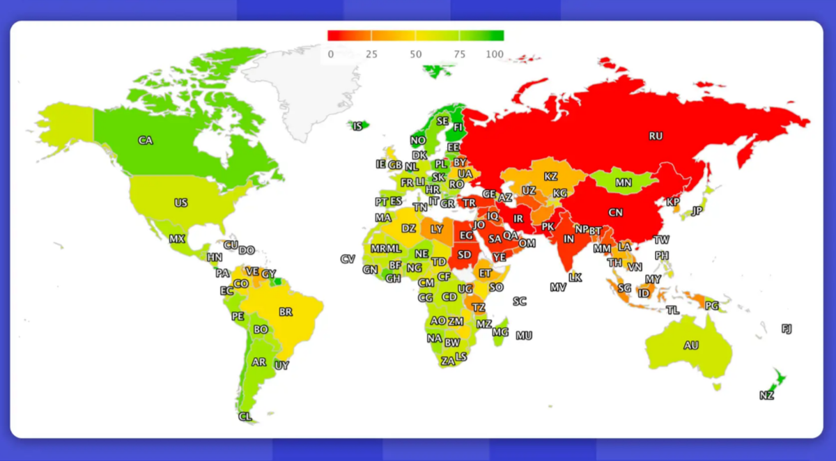 Россия заняла предпоследнее место в мире по уровню свободы интернета. Хуже только в Северной Корее