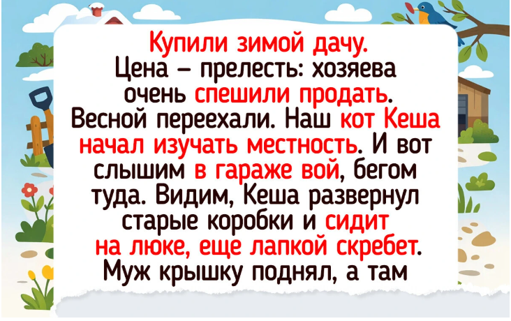 - Купили зимой с мужем дачу недалеко от города. Цена — прелесть. Хозяева очень спешили ее продать до весны. И вот в апреле переехали. Наш кот Кеша первые дня три не понимал, куда попал. Потом осмелел, начал изучать местность. И вот слышим в гараже вой, бегом туда. Видим, Кеша развернул старые коробки и сидит на люке, еще лапкой скребет, мяукает. Муж крышку поднял, а там — погреб с закатками и, конечно, с колбасами вялеными. Иннокентий наш гордо расхаживал и всем своим видом говорил: «Смотрите, что нашел! Нам тут еды на полгода. Я прокормил всю семью!» Потом он еще и мышей, и кротов нам все приносил. В общем, заботился, как мог.