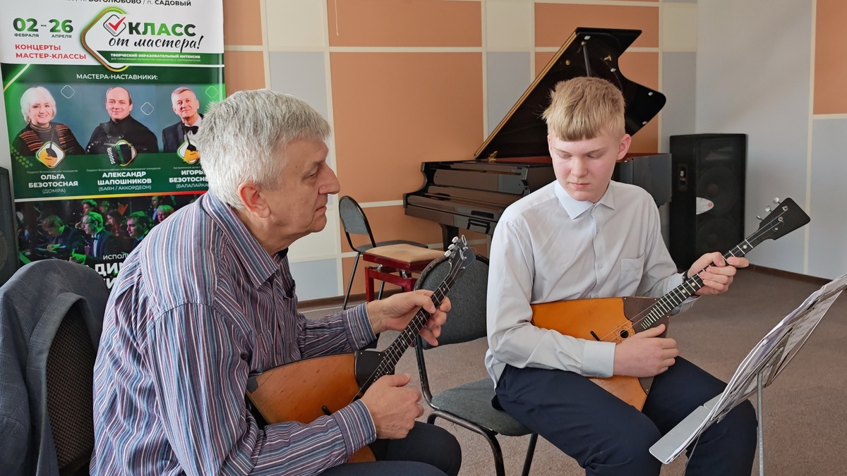 В Детскую школу искусств г.Петушки Игорь Безотосный и его коллеги по Владимирскому русскому оркестру - лауреаты всероссийских и международных конкурсов Александр Шапошников (баян) и Ольга Безотосная (домра) – приехали как мастера-наставники в рамках проекта «КЛАСС от мастера» АНО «Культурная среда», реализуемого при поддержке министерства внутренней политики Владимирской области.