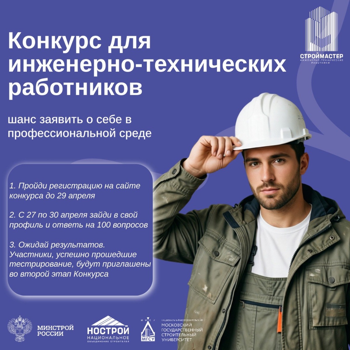 🗓 Даты: с 27 апреля по 30 апреля 2026 года. ❕ Подача заявок: до 29 апреля 2026 года. 🤝 Организаторы: Минстрой России, НОСТРОЙ, НИУ МГСУ. 📢 К участию приглашаются опытные специалисты, имеющий стаж работы на строительных объектах и студенты профильных учебных заведений, достигшие 18 лет. Конкурс проводится по двум номинациям: 💡«Лучший специалист по организации строительства» (профессионалы и студенты); 💡 «Лучший специалист по охране труда» (профессионалы). Успейте подать заявку на платформе Конкурса до 29 апреля 2026 года. ✔️ Соревнования проходятся в номинациях «Лучший специалист по организации строительства» и «Лучший специалист по охране труда». ➡️ Состязанием предусмотрено два этапа. Первый этап пройдет с 27 по 30 апреля 2026 года в дистанционном формате, конкурсантам предстоит пройти теоретическое тестирование на платформе ПАК «Конкурс». Участники, набравшие наивысшие баллы, получат право пройти в следующий этап, где могут продемонстрировать свои профессиональные навыки