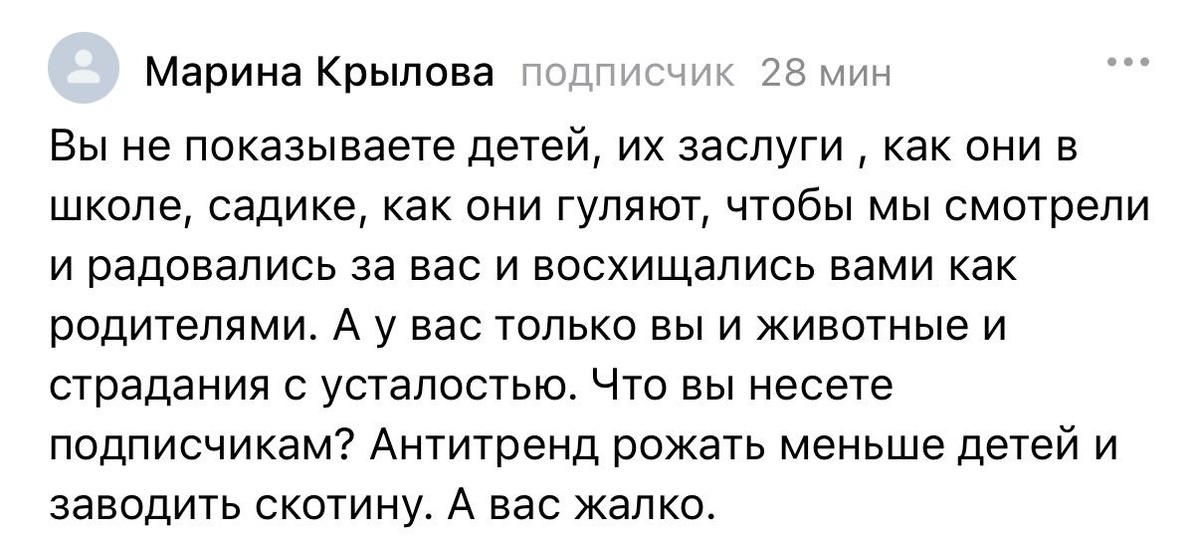 Вы не показываете детей, их заслуги, как они в школе, садике, как они гуляют, чтобы мы смотрели и радовались за вас и восхищались вами как родителями. А у вас только вы и животные и страдания с усталостью. Что вы несете подписчикам? Антитренд — рожать меньше детей и заводить скотину. А вас жалко. Рожать много детей я начала ещё до указа нашего уважаемого президента…Не ради наград, льгот, тренда или общественного одобрения. Я хотела большую семью — я её создала. Хотела дарить любовь и видеть, как она множится — получила. Но, знаете, никогда не думала, что я обязана перед кем‑то отчитываться о «заслугах» моих детей: как они гуляют, кушают, какают, ходят в школу, детский сад. «... чтобы мы смотрели и радовались за вас и восхищались вами как родителями». Такое ощущение, что если ты мать многодетная, то должна и даже обязана своих детей как экспонаты для демонстрации выставлять: «Докажите, что вы хорошая мама, покажите результаты» — так и сквозит между строк. А может, я не хочу, чтобы мной