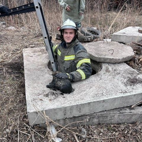 Комочек провалился в пятиметровую яму, громко скулил, но хозяйка не смогла помочь. Приехали пожарные, опустили лестницу и освободили пёселя из ловушки. Он цел, только чуть-чуть испачкался. Kras Mash #gbrzoo #gbrzoopomosh