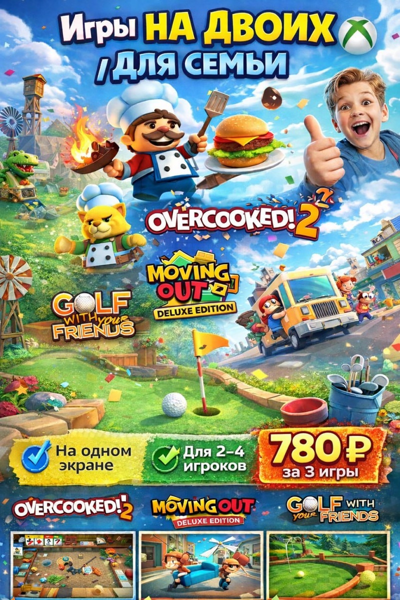 💥 Идеальный набор для вечера с друзьями или семьёй 👉 смех, хаос и куча эмоций гарантированы 😄 🍔 Overcooked! 2 Готовьте блюда в безумных кухнях и не ссорьтесь 😅 📦 Moving Out Deluxe Edition Переезды, диваны и полный хаос — играть вдвоём в разы веселее ⛳️ Golf With Your Friends Весёлый гольф с ловушками и трэшем 💰 Всего за комплект 780 руб.: выгоднее, чем покупать по отдельности 🔥 Почему берут: ✔️ идеально для 2–4 игроков ✔️ подходит детям и взрослым ✔️ можно играть на одном экране ✔️ простые и весёлые игры 📩 Пишешь в ЛС — подключу быстро за покупками 👉 @sxostore