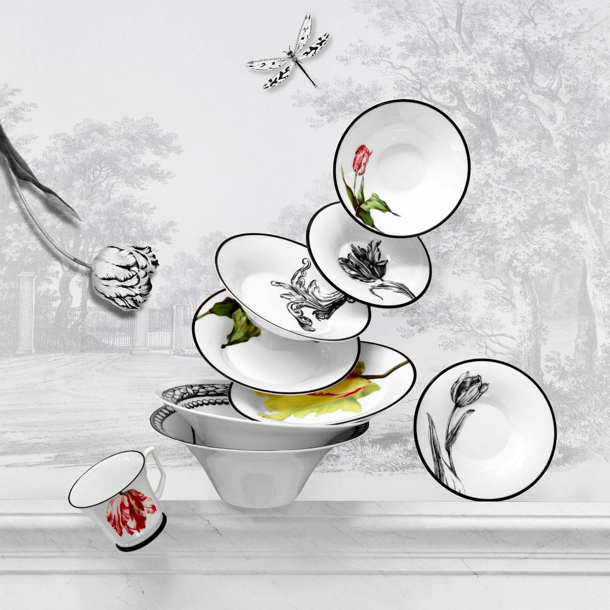 На белом костяном фарфоре — тюльпан. Красный, с чуть разлохмаченными лепестками, написанный живо, почти ботанически точно. Рядом на той же тарелке — гравюрный декор: гирлянды, аканты, завитки, которые легко представить на архитектурном фрагменте или обоях дворянского дома. Два способа смотреть на растение сведены в одном предмете: цветок как природный объект и цветок как культурный знак. Коллекция «Волшебный сад» Императорского фарфорового завода — работа петербургского художника Сергея Сысоева. Для него тюльпан — сквозной мотив, который он ведёт через разные проекты. Здесь этот мотив попал в среду, где у него есть своя история: фарфор давно умеет обращаться с цветком как с символом. Голландская живопись XVII века, мейсенские сервизы, русский ампир — везде тюльпан появлялся как знак вкуса, достатка, точного взгляда на натуру. Сысоев не воспроизводит эту традицию буквально. Он работает с ней как с материалом. Часть декоров в коллекции — чисто графические, монохромные: старинная гравюра