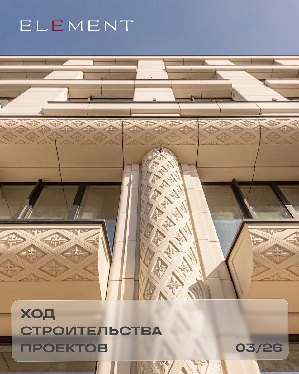 Держите свежую динамику: «17/33 Петровский остров» Продолжается облицовка фасада стеклофибробетоном, здание обретает свой финальный вид. Внутри ведутся работы по инженерии: разводка электрики в общественных пространствах, монтаж главных магистралей кондиционирования и слаботочный сетей. Предчистовая отделка идёт и в общих пространствах, и в апартаментах. Трансформаторные подстанции уже на месте. В новом Доме продаж — финишная отделка. Скоро покажем результат! «Башни Элемент» Главная новость марта — монолитные работы консольных частей небесного моста завершены. Башни тем временем еще подросли: Во всех башнях возводятся внутренние перегородки. «Новая, 11» Активно приступили к первому этапу строительства: на объекте два автокрана и буровая установка. Выполняются работы по раскопкам и водопонижению, также ведётся устройство ограждения котлована. Это начало новой истории Москвы! Смотрите фотоотчёт — по ссылке. Если удобнее читать нас в MAX, подписывайтесь! #Element