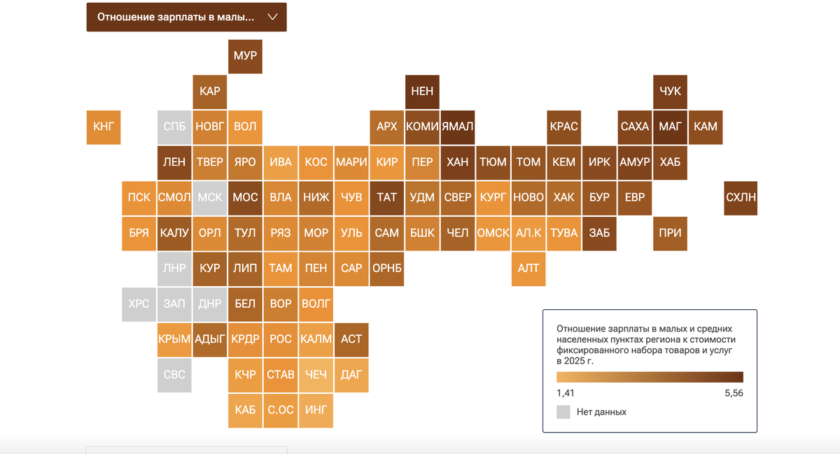 Для каждого региона средняя зарплата в малых и средних населённых пунктах рассчитывалась отдельно – без учёта крупнейших городов (с населением свыше 200 тысяч человек либо с числом занятых на крупных и средних предприятиях более 50 тысяч) и без региональных столиц. Данные о зарплатах взяты из официальной муниципальной и региональной статистики по крупным и средним предприятиям за 2025 год с учётом уплаты НДФЛ. Стоимость фиксированного набора товаров и услуг определена как средняя за 12 месяцев 2025 года.