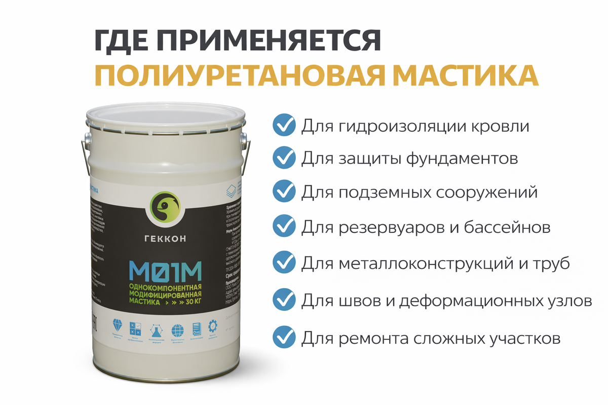 - Геккон М01 — универсальная полиуретановая мастика для гидроизоляции;