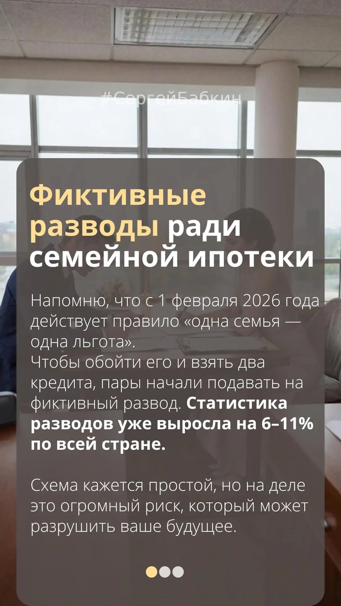 Схема кажется простой: по правилу, которое действует с 1 февраля 2026 года «одна семья — одна льгота», супруги не могут взять две ипотеки. И если в семье двое и более детей, пара может расторгнуть брак, чтобы каждый из родителей оформил кредит на себя.