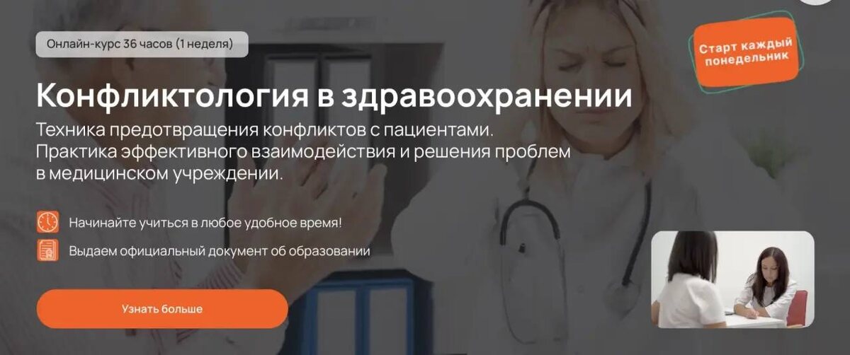 Научитесь предотвращать и разрешать конфликты с пациентами! Наш курс по конфликтологии создан специально для медицинских работников, которые хотят повысить качество общения и укрепить доверие с пациентами. Вы освоите современные техники предотвращения и разрешения конфликтных ситуаций, научитесь работать с возражениями и стрессом, а также сможете эффективно применять полученные знания на практике. ▌ Почему стоит выбрать наш курс? – Практическая направленность: реальные кейсы, интерактивные занятия и индивидуальные рекомендации. – Авторитет: программы разработаны при участии ведущих экспертов, методистов и представителей медицинского сообщества. – Актуальность: полное соответствие современным требованиям и правовым нормам аккредитации медработников. ▌ Для кого этот курс? Для врачей, медицинского персонала и организаторов здравоохранения, стремящихся повысить уровень профессионализма, снизить количество конфликтных ситуаций и улучшить взаимоотношения с пациентами. Запишитесь на к