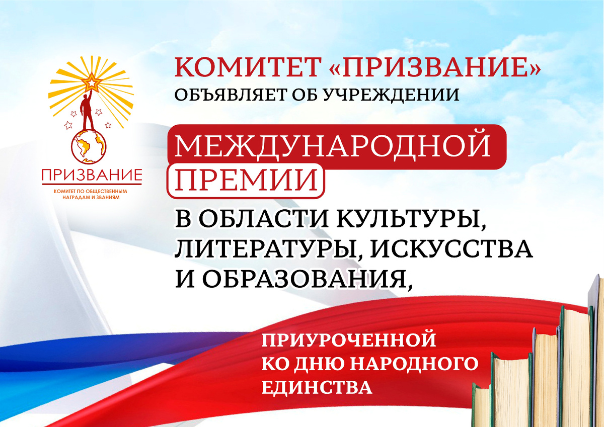 Комитет «Призвание», руководствуясь высшими идеалами служения обществу и развитию гуманитарного знания, объявляет об учреждении Международной премии в области культуры, литературы, искусства и образования, приуроченной ко Дню народного единства. Эта премия задумана как масштабный, системный проект, целью которого является выявление, поддержка и публичное признание наиболее выдающихся деятелей и проектов, формирующих современное культурное пространство и укрепляющих его интеллектуальные, духовные и образовательные основы. Награждение является не только актом признания прошлых достижений, но и инвестицией в будущее, символизируя призвание лауреатов к дальнейшей созидательной работе. Премия будет присуждаться на конкурсной основе по следующим категориям (в каждой категории может быть только один лауреат): 1. За выдающийся вклад в развитие международного культурного сотрудничества и диалога; 2. За создание социально значимой литературы для детей и юношества, формирующей ценности доброты, с