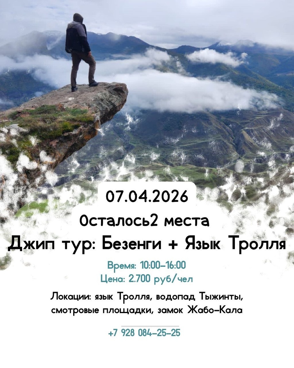 ‼️ 🚗 Выезд: 5 марта с 10:00 до 16:00. Стоимость тура всего 2700 рублей с человека. 🌄 Что мы увидим? ☀️ «Язык Тролля» — потрясающая смотровая площадка с видом на главный Кавказский хребет и Безенгийскую стену. 🏞️ Уникальные смотровые площадки, откуда открываются виды, оставляющие неизгладимое впечатление. 💦 Водопад Тыжинты - мохнатый водопад 🏰 Замок Жабо-Кала, который таит в себе легенду. Информация о нас: 📌 Наш адрес: г. Нальчик, пр. Ленина, 32, гостиница «Россия», офис 245. 🔔 Подробности на нашем сайте: pelican07.ru 📢Телефон для связи: +7 928 084 25 25, +7 918 728 39 79