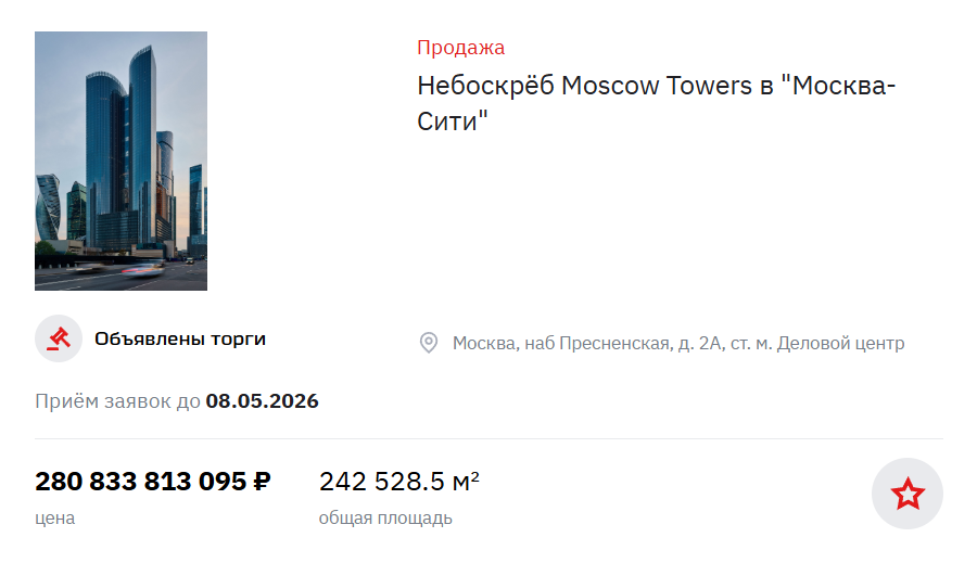 На официальном портале монополии - Недвижимость РЖД появился лот с предложение покупки офисных площадей в башне Moscow Towers общей площадью 242 тыс. квадратных метров за 280 млрд рублей. В продажу входят офисы и аппартаменты, которые планировались для руководителей. Площади: - 206 тыс. кв. м офисов; - 15,8 тыс. кв. м апартаментов; - остальное — кладовые и машино-места. Вместо ремонта вокзалов и инфраструктуры, деньги тратились на непонятные покупки зданий с аппартаментами... Вот она, эффективность госмонополии.