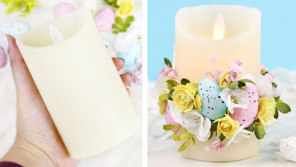Купила светодиодную свечу и украсила её цветами из фоамирана. Получился шикарный декор на Пасху своими руками