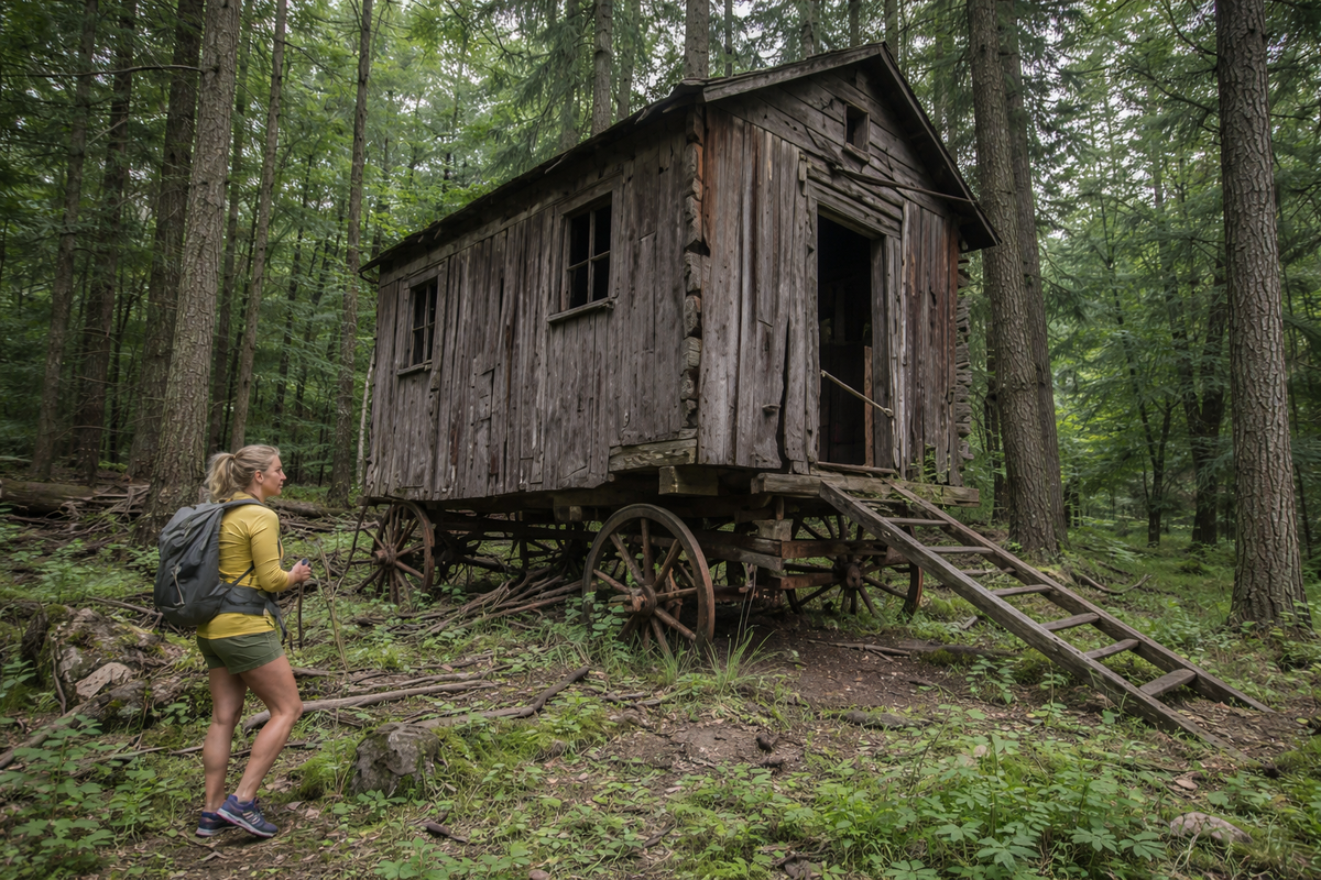 Пытаясь выбраться, сквозь стену дождя она заметила странную, слишком ровную для леса конструкцию. Подойдя ближе, Вера замерла: перед ней стоял огромный старинный вагон на деревянных колесах, заросший мхом, но превращенный в крепкий бревенчатый дом.