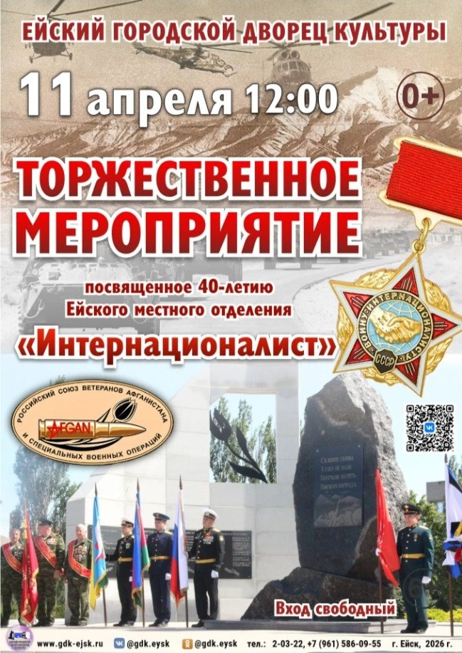 11 апреля в 12:00 состоится торжественное мероприятие, посвящённое 40-летию Ейского местного отделения «Интернационалист».