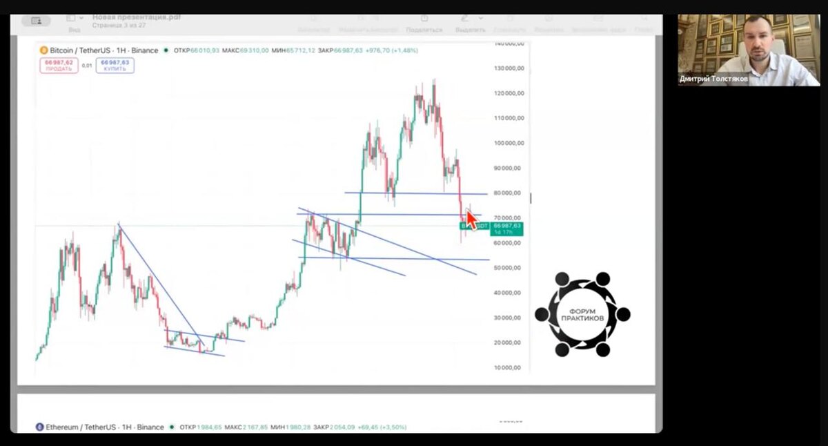 В субботу встречались онлайн с участниками Форума практиков по крипте. Разобрали, что сейчас на самом деле происходит на рынке крипты, я поделился своим видением. Если коротко: Сейчас рынок находится в фазе неопределенности и консолидации. Биткоин зажат в диапазоне примерно 60–72 тыс., и ближайшие месяцы с высокой вероятностью останется в этой зоне. Рынок живет под влиянием сразу нескольких факторов. Во-первых, макроэкономика: — ставка ФРС с высокой вероятностью не будет снижаться быстро — ликвидности меньше, чем год назад — объемы на рынке ниже, чем в предыдущих циклах Во-вторых, геополитика. Сейчас рынок напрямую реагирует на напряжение вокруг Ирана, риторику Трампа и в целом на усиление турбулентности в мире. Любые подобные события — это перераспределение капитала и рост неопределенности. А крипта, как риск-актив, в такие периоды не растет. Это и дает нам боковик. При этом фундаментально ничего не сломалось. Более того — происходят важные вещи: — обсуждается регулирование кр