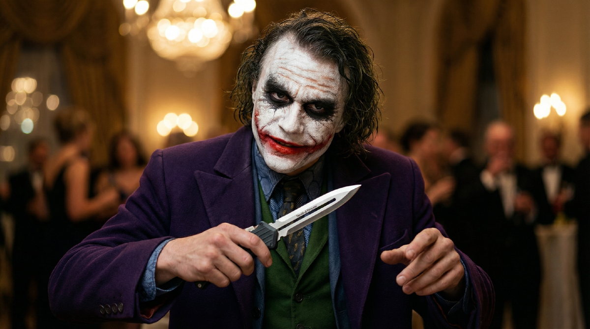Когда полицейские выворачивают карманы Джокера в «Темном рыцаре», на стол падает много ножей. Автоматические, кинжальные, с зеркальной полировкой. Один из них сегодня стоит как хороший смартфон — почти 1000 долларов. Но есть там и кое-что другое. Овощечистка. Обычная картофелечистка за пару баксов. Для фанатов фильма этот предмет до сих пор — повод для споров. Зачем психопату кухонный девайс? И какой нож в кадре настоящий? Разбираемся по порядку.