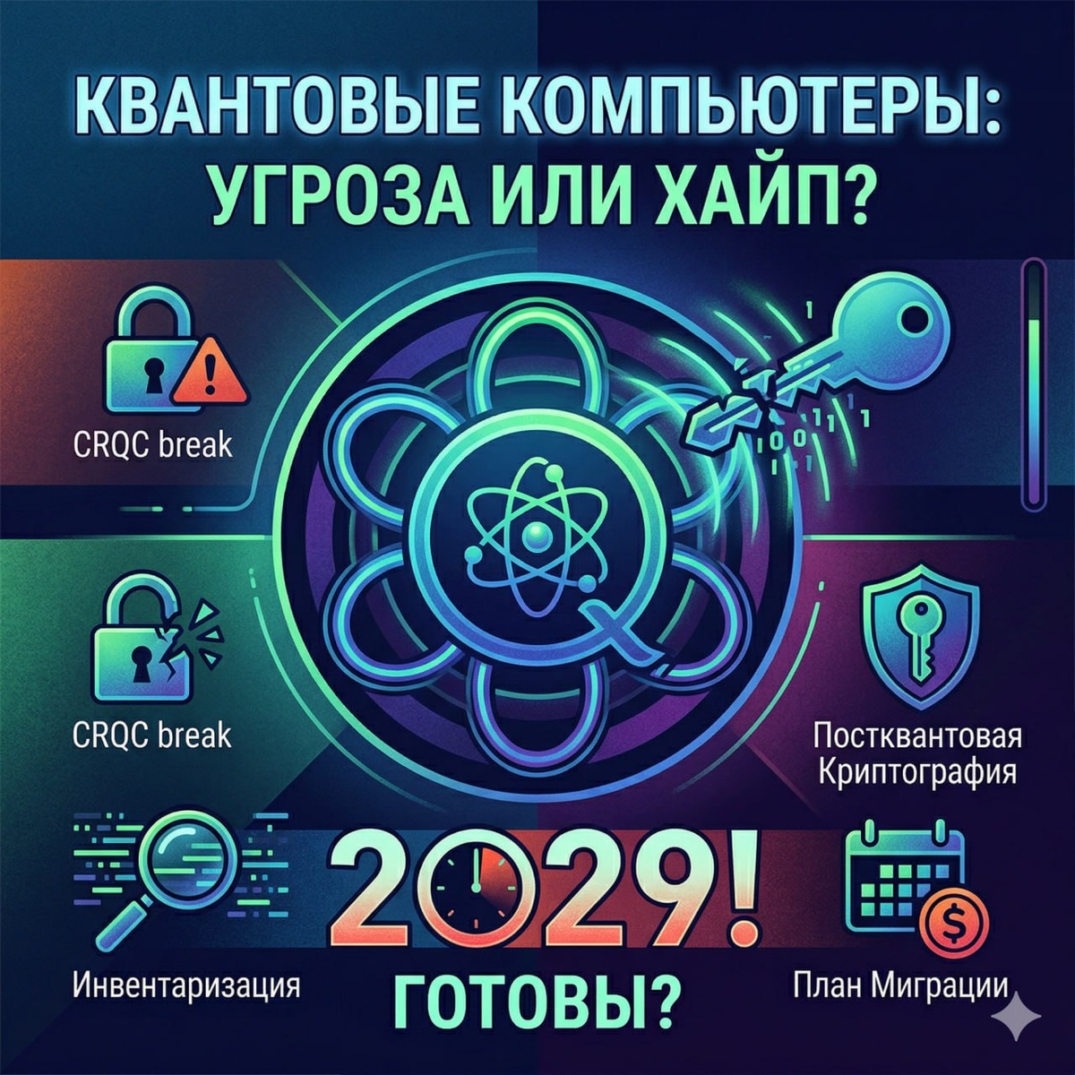 ? Google объявила: дедлайн миграции на постквантовую криптографию — 2029 год. 2029! Игнорировать уже нельзя. Что нужно знать CRQC — это квантовый компьютер, способный сломать RSA и ECDH. Он ещё не существует, но государства его ждут и уже активно действуют. Угроза реальная уже сегодня. Эта угроза называется HNDL (Harvest Now, Decrypt Later). Прямо сейчас ваш зашифрованный трафик записывают, и, что обидно, его расшифруют, когда появится CRQC. Если в вашем трафике сегодня гостайна, медданные или банковские транзакции — они уже в очереди на расшифровку. Что ломается, что нет Асимметричные алгоритмы RSA, ECDH, ГОСТ 34.10 — под ударом. Симметричные алгоритмы, например ГОСТ и AES-256, — держатся. Под угрозой оказался алгоритм обмена ключами, который встроен сегодня в TLS, VPN, PKI, ЭЦП. Это именно то, на чём строится аутентификация и защита каналов. Самое опасное — банковские транзакции. Для кого-то — информация в мессенджере. Что уже сделано в мире Cloudflare защитил PQC уже 52% своег