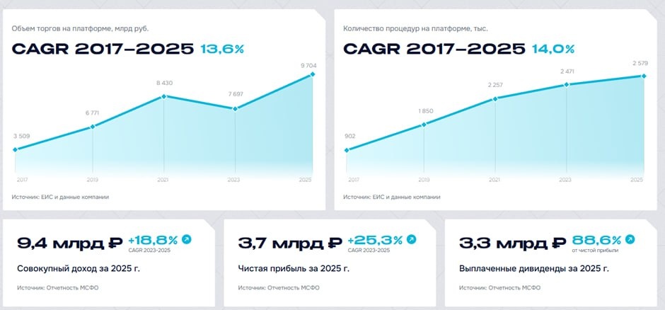 После паузы рынок IPO начинает оживать — формируется новый пул компаний. В их числе B2B-РТС, которая планирует выход на биржу. 👉 Что за бизнес B2B-РТС — крупнейшая российская электронная торговая платформа для бизнеса и государства, через которую проходят торги, закупочные процедуры и взаимодействие поставщиков с заказчиками. 👉 Рынок Объём цифровых закупок в России сегодня — около 53 трлн рублей, остальное - регулируемые закупки, закупки государства и госкомпаний. Что интересно - если в регулируемых закупках уровень цифровизации уже высок, то в коммерческий И ключевой момент заключается в том, что этот сегмент все еще недооцифрован (около 22–25% против 40%+ в развитых странах), что создает долгосрочный потенциал роста. 👉 Финансовая динамика Совокупный доход вырос с 6,6 до 9,4 млрд рублей (CAGR ~19%). Основной бизнес даёт около 15% роста. 👉 Прибыль и маржинальность EBITDA выросла с 3,4 до 4,9 млрд рублей при марже выше 50%. Чистая прибыль — с 2,4 до 3,7 млрд рублей (CAGR ~25%) с