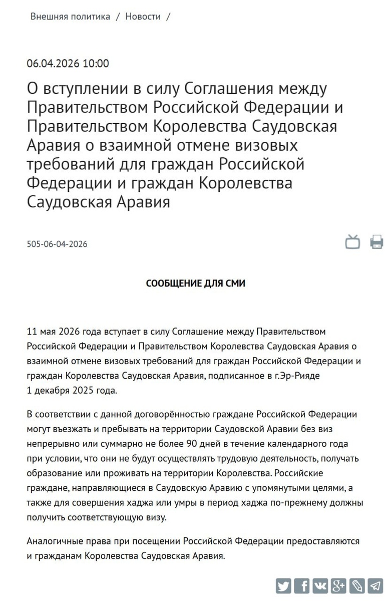 ! 🗓 С 11 мая 2026 года вступает в силу соглашение о безвизовом режиме между Россией и Саудовской Аравией. 🇷🇺 Граждане России смогут находиться в королевстве до 90 дней в течение года без оформления визы. ⚠️ Правило не распространяется на поездки с целью работы, учёбы, проживания или паломничества. 🛂 Аналогичные условия будут действовать для граждан Саудовской Аравии при въезде в Россию, сообщили в МИД РФ. #СаудовскаяАравия #безвиз #путешествия @takeyourbackpack