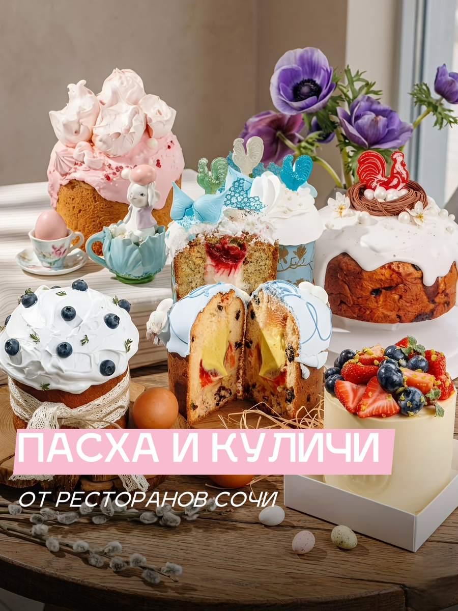 Клёво Морской порт — праздничная творожно-ванильная пасха с курагой и изюмом, глазированная белым шоколадом, декорируется свежими ягодами и фисташкой – 690г/3290₽ Предзаказы принимаются на сайте до 11 апреля включительно. Lali — пасхальный кулич с фисташкой и малиной. Нежное тесто с цитрусовыми цукатами, бархатный фисташковый крем внутри, малиновое кули, воздушная маршмеллоу-глазурь, безе и изящный декор – 550г/850₽ Предзаказы принимаются до 10 апреля включительно в ресторане или по телефону: Адлер +7(964)946-10-01 Красная Поляна +7(965)457-55-48 Fettuccine — панеттоне с арахисовой сгущенкой, итальянской меренгой и безе – 600г/1300₽ Оформить предзаказ можно до 10 апреля в ресторане или по телефону: +7(988)185-55-75 Аромат корицы — маково-лимонный кулич. Творожное тесто с маком, цедрой лимона и кусочками белого итальянского шоколада. Внутри — жидкий центр из ванильного ганаша на бурбонской ванили и кисло-сладкий клюквенный соус – 750г/2200₽ Заказы принимаются до 10 апреля включительно н