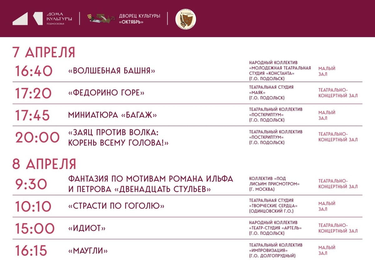 ✨ IX ОТКРЫТЫЙ ФЕСТИВАЛЬ «НА ТЕАТРАЛЬНЫХ ПОДМОСТКАХ»🎭 7️⃣ и 8️⃣ апреля театральные коллективы из разных городов области представят свои спектакли. ✔️С программой фестиваля можно ознакомиться по ссылке https://clck.su/paNHP ✔️Вход на все спектакли бесплатный. 📆 07.04.2026 🏢 Дворец культуры «Октябрь» 📍 г. Подольск, ул. Свердлова, д.38 💰 Вход свободный❗️ ⭐Поддержать канал голосом 🍰Где поесть в Подольске ✅ Мероприятия Подольск https://dzen.ru/id/66ed500f7b5671493eca3fd6 https://vk.ru/podolsk_events http://dzen.ru/podolsk_events