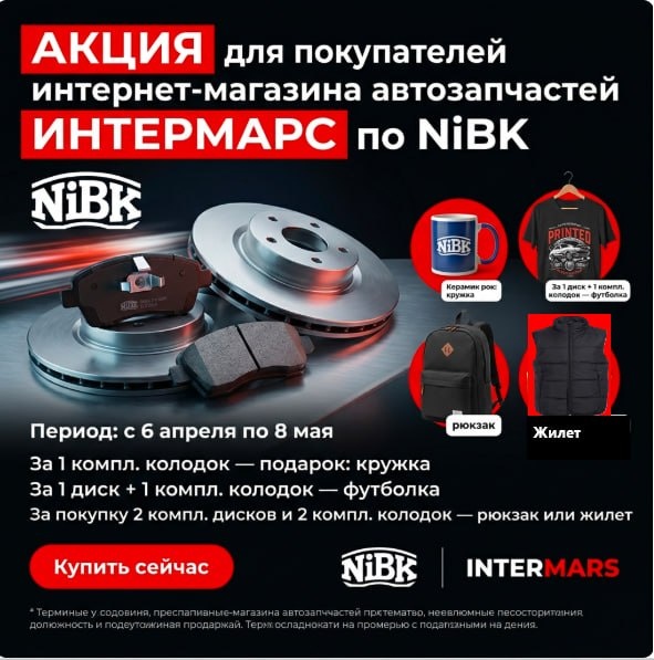 ! Интернет‑магазин «ИНТЕРМАРС» дарит подарки за покупку тормозных компонентов NiBK! Акция действует с сегодняшнего дня по 8 мая. Как получить подарок: -Купите 1 комплект тормозных колодок получите кружку в подарок! -Купите 1 комплект дисков + 1 комплект колодок забирайте футболку! -За полную замену (2 комплекта дисков и 2 комплекта колодок) мы подарим вам рюкзак или жилет! Обновляйте тормозную систему выгодно — и получайте полезные аксессуары!