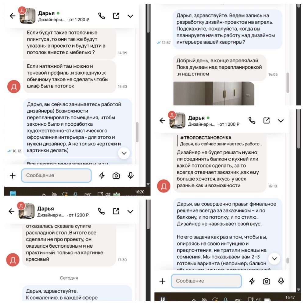🥺 Дарья написала мне 6 марта — Здравствуйте! Сколько времени займет работа? А 3 апреля она всё ещё думала над перепланировкой и стилем. Почти месяц переписки. Я отвечала на всё: про обои под покраску, трековые системы, багеты, узаконивание перепланировки, шкафы в потолок. Но Дарья продолжала копать сама. Вот её главные боли, которые я увидела: ✅ Потеря времени Она пишет: «В каждом стиле нравится понемногу — получается винегрет». Ищет свой стиль неделями, хотя я могла показать 2–3 варианта за одну встречу. Она пытается разобраться в технике, хотя это моя работа. ✅ Слив бюджета (и страх повторить) Дарья рассказала: «Уже есть опыт — дизайнер сделала проект кухни, а на стройке оказалось, что в проходе мало места. Дизайнер отказалась переделывать, сказала "купите раскладной стол". В итоге ремонт делали не по проекту, он оказался бесполезным». Она боится снова заплатить за красивую картинку, которая не работает в реальности. ✅ Страх «не будет как на картинке» Она переживает: «Цвет сте