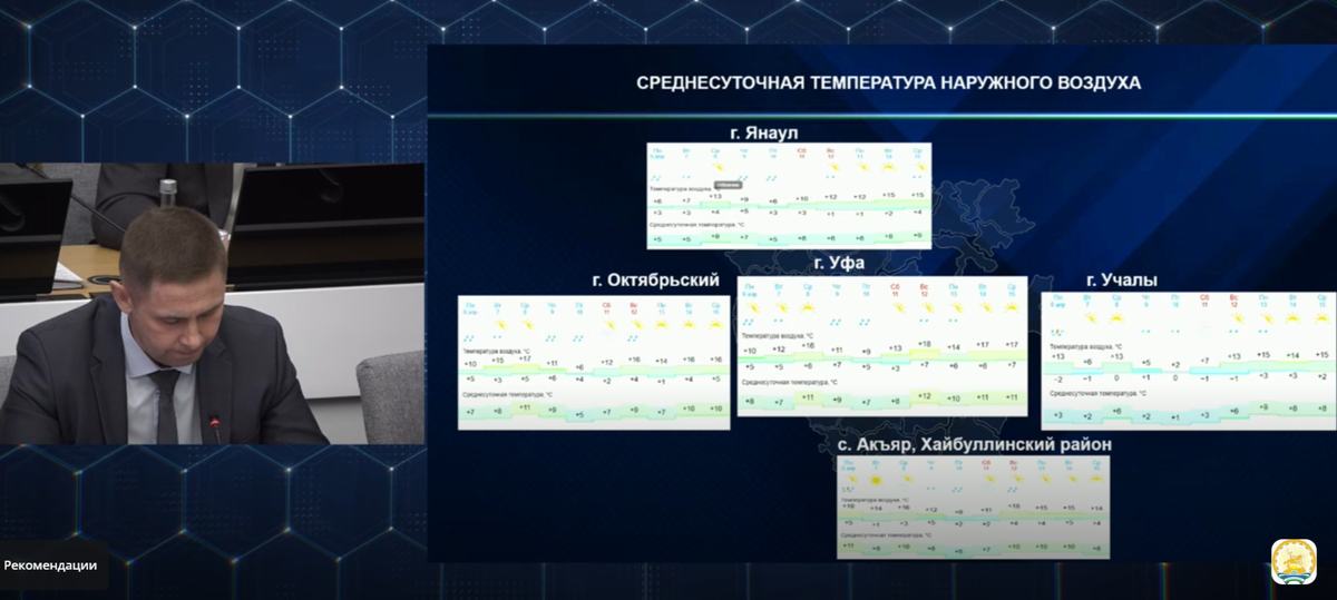 И.о. министра ЖКХ РБ Юрий Палтусов на оперативном совещании в правительстве РБ рассказал, когда отключат отопление. Спикер сообщил, что на этой неделе температура еще опустится ниже 0 градусов. Поэтому большинство муниципалитетов планирует отключать отопление во второй половине апреля. Между тем, в Мелеузовском районе приняли решение прекратить подачу тепла еще 1 апреля, одна коммунальные службы готовы возобновить его при резком снижении температуры. Ситуация находится на контроле. Фото: скриншот трансляции оперативного совещания в правительстве РБ.