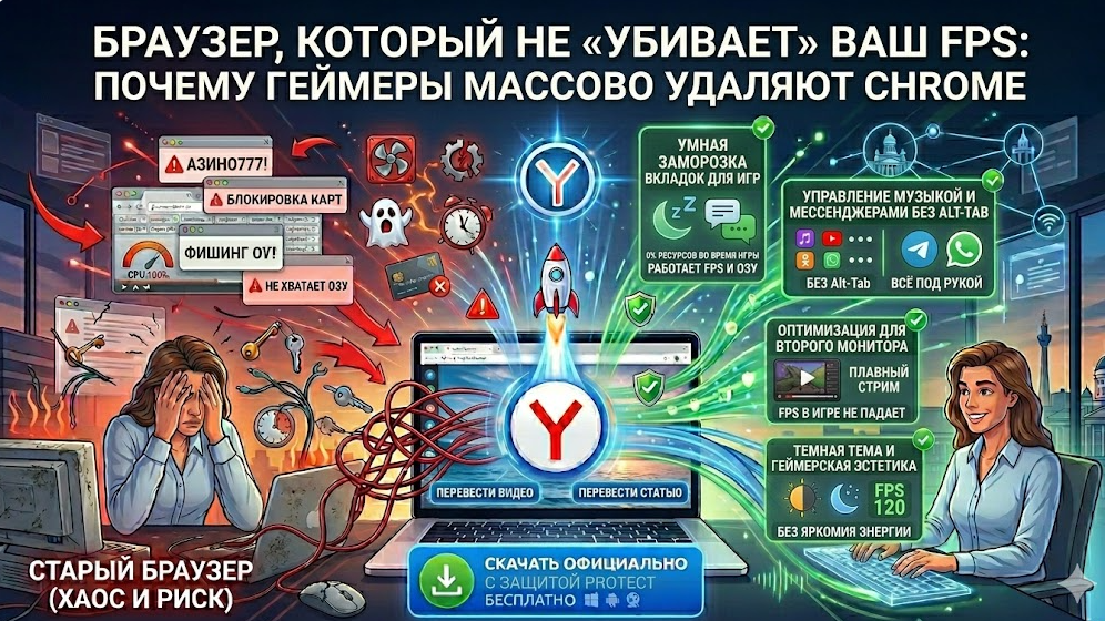 Представьте ситуацию: у вас напряженная «катка» в соревновательном шутере или важный рейд, от которого зависит успех всей команды. Вы полностью сосредоточены, как вдруг изображение начинает дергаться, игра фризит, а счетчик FPS предательски ползет вниз. Вы сворачиваете игру (молясь, чтобы она не вылетела), открываете Диспетчер задач и видите главного виновника. Ваш привычный браузер «съел» 4 гигабайта оперативной памяти просто потому, что на фоне висит пара вкладок с гайдами, интерактивной картой и включенной музыкой. Для геймера каждый кадр в секунду и каждый мегабайт ОЗУ на вес золота. Современные игры требуют максимум ресурсов компьютера, и делить их с прожорливым софтом непозволительно. Если ваш ПК задыхается во время игры, не спешите покупать новую видеокарту или плашки памяти. Для начала смените обозреватель. Мы рекомендуем бесплатно скачать оптимизированную версию Яндекс Браузера по официальной ссылке. Это программа, которая уважает ваши системные ресурсы. Главная проблема больш