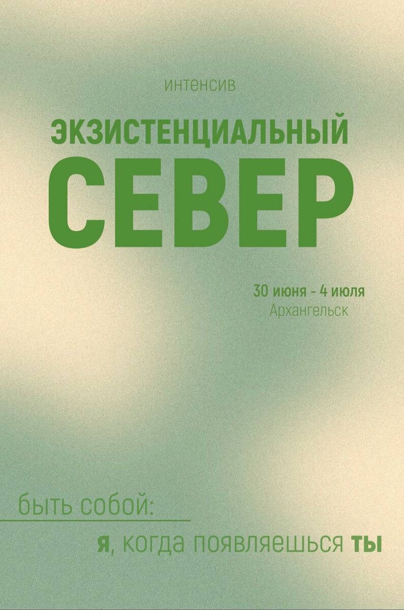 ! Третий интенсив «Экзистенциальный север» с темой: «Быть собой: я, когда появляешься ты» 30 июня - 4 июля, Архангельск Записаться и узнать подробности можно по ссылке: https://ekzishkola.ru/be_yourself