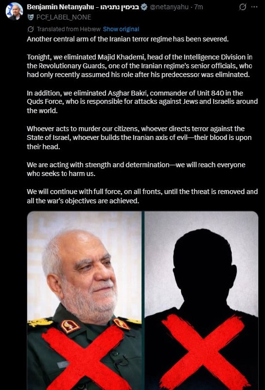 Netanyahu celebrates elimination of top Iranian official 'Tonight, we eliminated Majid Khademi' 'We will reach EVERYONE who seeks to harm us' 'We will continue with full force, on all fronts, until the threat is removed and all the war's objectives are achieved'