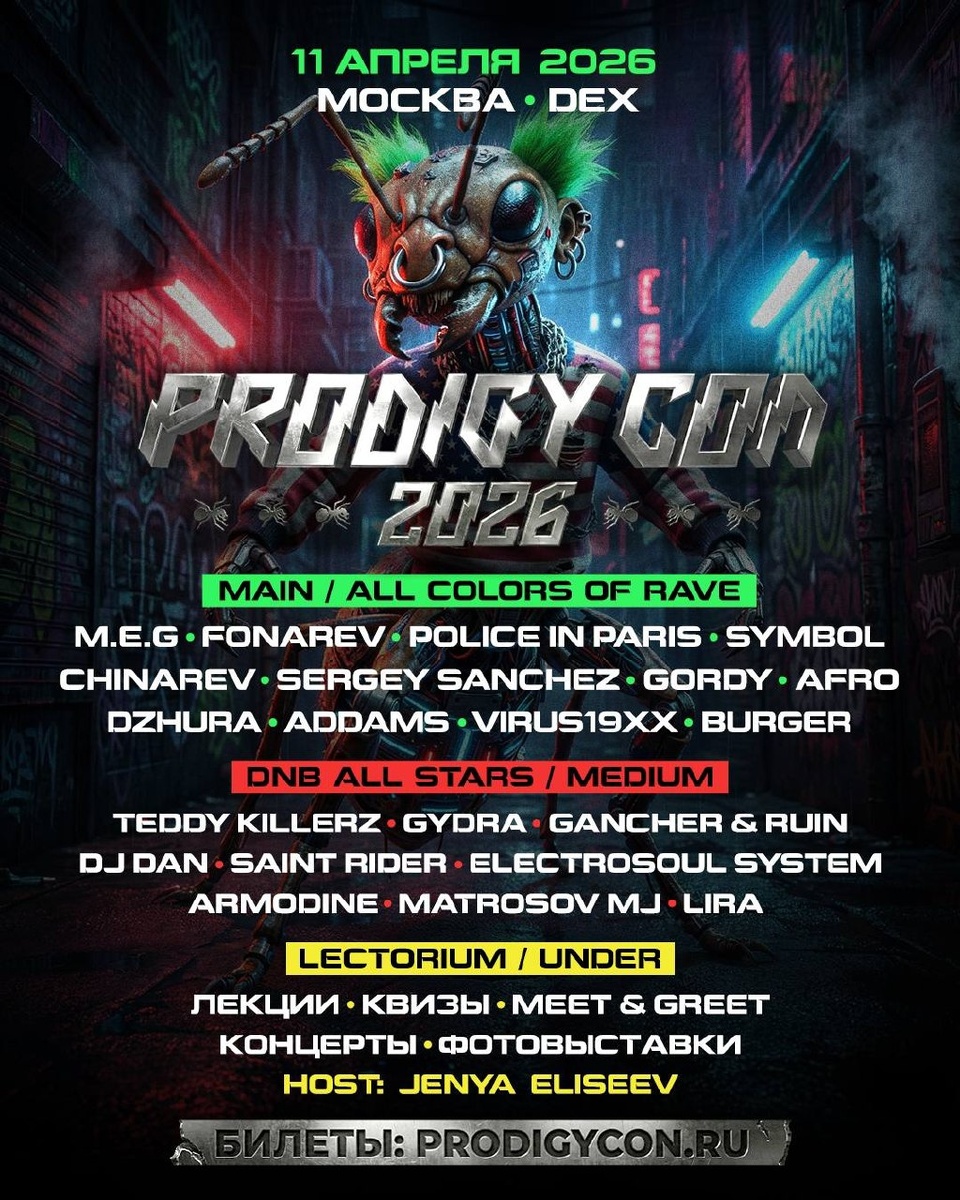 11 апреля / Москва Новая глава главного столичного рейва для тех, кто застал электронную сцену нулевых, и тех, кто мечтает окунуться в ту атмосферу сегодня. Ночь, когда олдскул и новая школа EDM сливаются в едином экстазе. 9 часов рейва, 3 танцпола, 20+ артистов. Это Prodigy Con, детка 🔥 Хедлайнеры: MEG, Police in Paris, Teddy Killerz, Gydra, Gancher & Ruin, Fonarev, Sergey Sanchez, Symbol, Chinarev, Gordy, DJ DAN, Electrosoul System, Saint Rider и еще дюжина топ-артистов. А 25 апреля Prodigy Con переедет в Санкт-Петербург 😉 Подробности в канале @prodigycon 🎫 Билеты Промокод DVIZH 📆 11 апреля, 21:00 - 06:00 📍DEX, Москва , Шарико- подшипниковская ул., 13, стр. 32