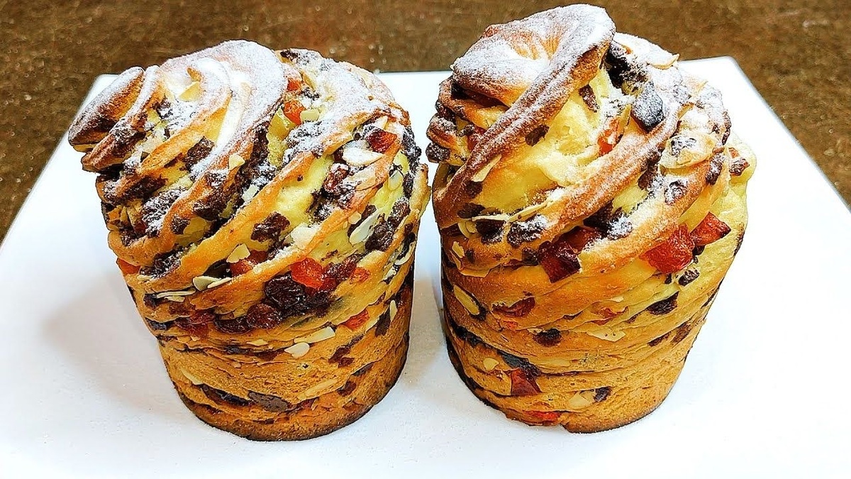 "! Готовить будем быстрый кулич-краффин из готового слоёного теста.🥞 Что нам понадобится:🍚 Тесто слоёное дрожжевое - 500 г Сливочное масло - 70 г Изюм или цукаты - 130 г Сахар -- 3 ст. ложки Сахарная пудра для украшения Важно ❗ Слоёное тесто достаньте из морозилки заранее, чтобы оно разморозилось при комнатной температуре. ❗Сливочное масло тоже достаньте заранее, чтобы оно немного подтаяло и им удобно было смазывать тесто. ❗ Изюм и цукаты залейте тёплой (почти горячей) водой на 5 минут. Инвентарь:🍽 Скалка Нож Силиконовые формочки или одноразовые формы для кулича ( две большие или 4- маленькие