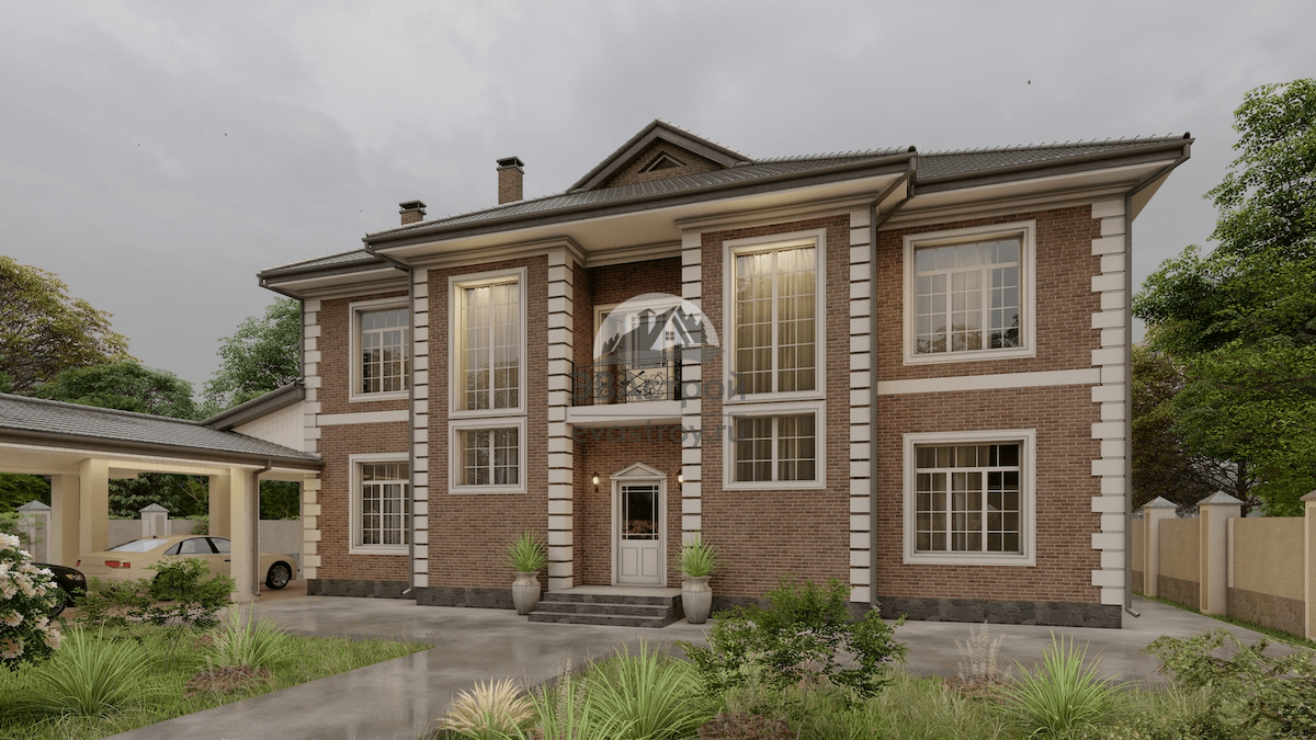 Номер проекта: 107-50 (П125) Разделы проекта: Архитектурный и Конструктивный разделы Узнать о проекте больше можно на сайте evastroy.ru или по телефону +7 (495) 175-30-40 Представляем проект дома для большой семьи. Двухэтажный загородный особняк выполнен в классическом стиле, его общая площадь 376 м2, габариты — 16 x 19.5 м. Предназначен для 6-7 человек. На первом этаже 63 м2 занимает кухня-столовая-гостиная. В зоне отдыха предусмотрен камин и настенный телевизор, в кухне — угловая рабочая часть, обеденный полуостров и большой стол для торжественных случаев. Центральное окно ведет на крытую часть террасы (фактически это веранда 30 м2). В передней части находится прихожая 15 м2; светлая и просторная; в ней предусмотрено окно, компактная гардеробная, шкаф-купе, небольшой диван и вход в бойлерную. Бойлерная 8 м2, также с окном, сблокирована с санузлом и кухней. Из холла (17 м2) доступна спальня (19 м2) и санузел с ванной (10 м2). На втором этаже 4 спальни — две с личными санузлами и гарде