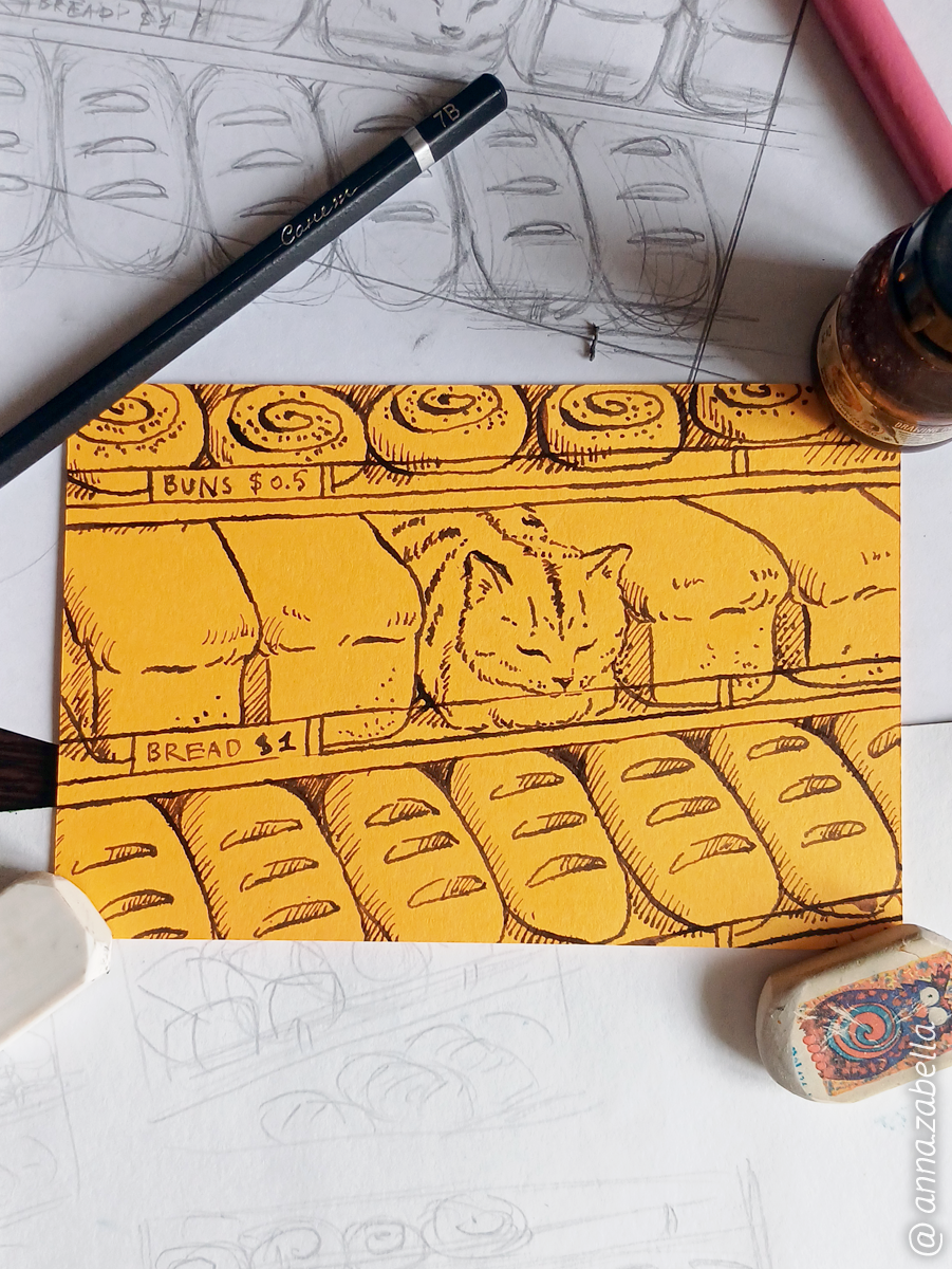 Иллюстрация для Инктобер52 - PRETEND (притворяться) 🐾 Показываю процесс создания этой тёплой булочной сцены: 1️⃣ Идея Берём простую и немного забавную концепцию: кот, который идеально вписывается в ряд буханок. 2️⃣ Карандашный эскиз Намечаю перспективу, ритм буханок и силуэт кота — он должен читаться, но не выбиваться. 3️⃣ Коричневая тушь от Koh-i-noor Обвожу коричневыми чернилами: — сначала крупные формы — затем добавляю штриховку (подчёркиваю объём хлеба и мягкость кота) — немного «живой» линии, без идеальной ровности — это добавляет уюта 4️⃣ Тон Оранжевая бумага даёт базу, чернила добавляют тени — получается тёплая «выпеченная» палитра. 5️⃣ Детали Надписи, текстура корочки, усы и мордочка. Совет: не рисуйте повторяющиеся элементы совершенно одинаковыми. Небольшие различия делают живыми и правдоподобными 🧡 #annazabella_art