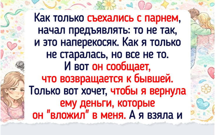 - Жили с парнем пять лет. Я хорошо зарабатывала, он просил наличку «в долг» — обещал перевести на карту. Потом я нашла его переписку с другой и сказала: «Прощай». А он вдруг заявил, что все пять лет одалживал мне деньги и потребовал вернуть — набежало больше 10 тысяч долларов! Я напомнила, что давала ему наличные. В итоге он остался ни с чем, но нервов стоило много. @ ADME