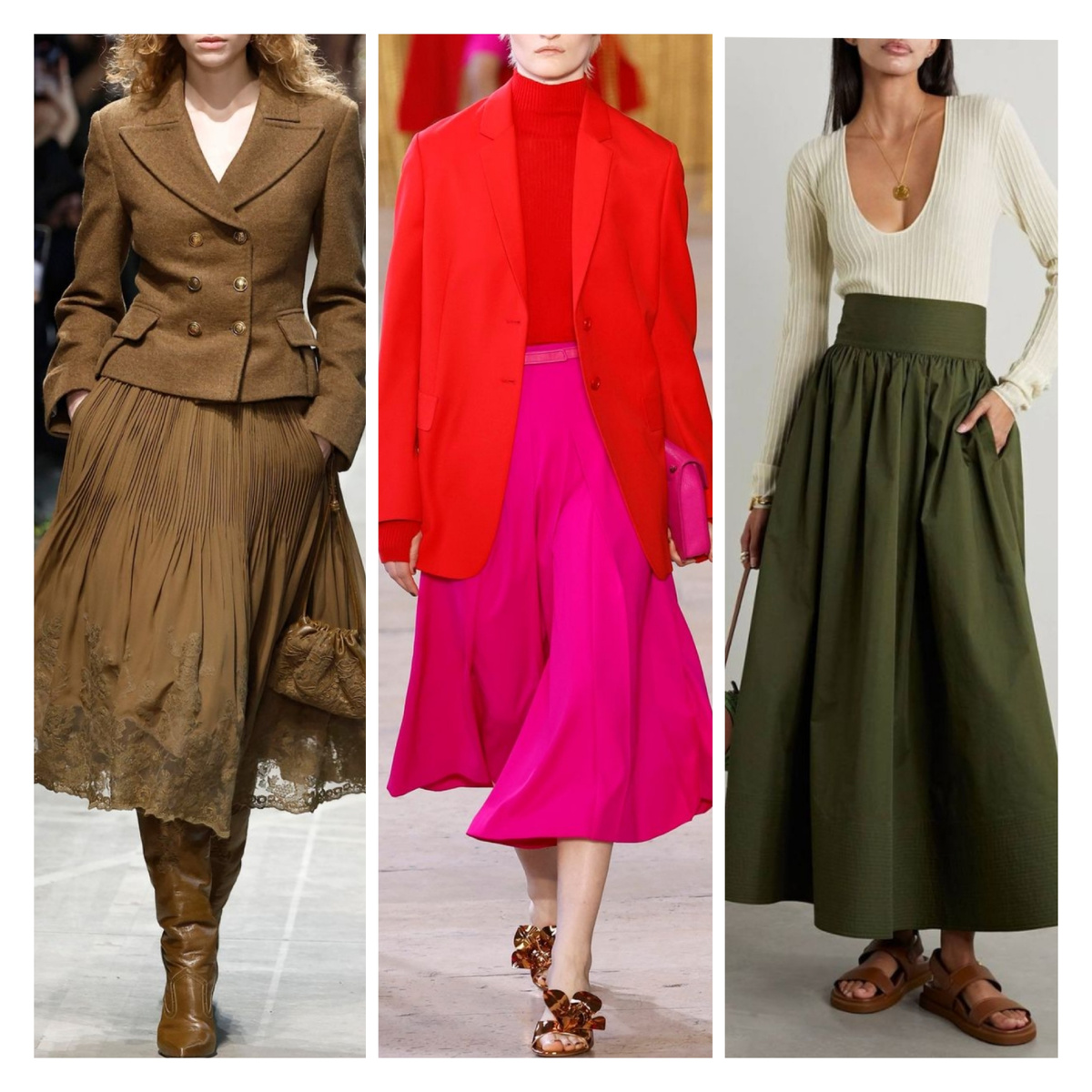Подиум в этом сезоне был буквально заполонён пышными юбками разной длины. Дизайнеры выводили на подиум моделей в юбках-солнце: от колена и миди до макси. Стоит отметить, что с короткими вариантами стоит быть осторожнее — они могут визуально расширить бёдра и нарушить пропорции силуэта. В то же время юбки длиной ниже колена и до щиколотки добавляют образу женственности, а вертикальные линии кроя визуально удлиняют ноги.