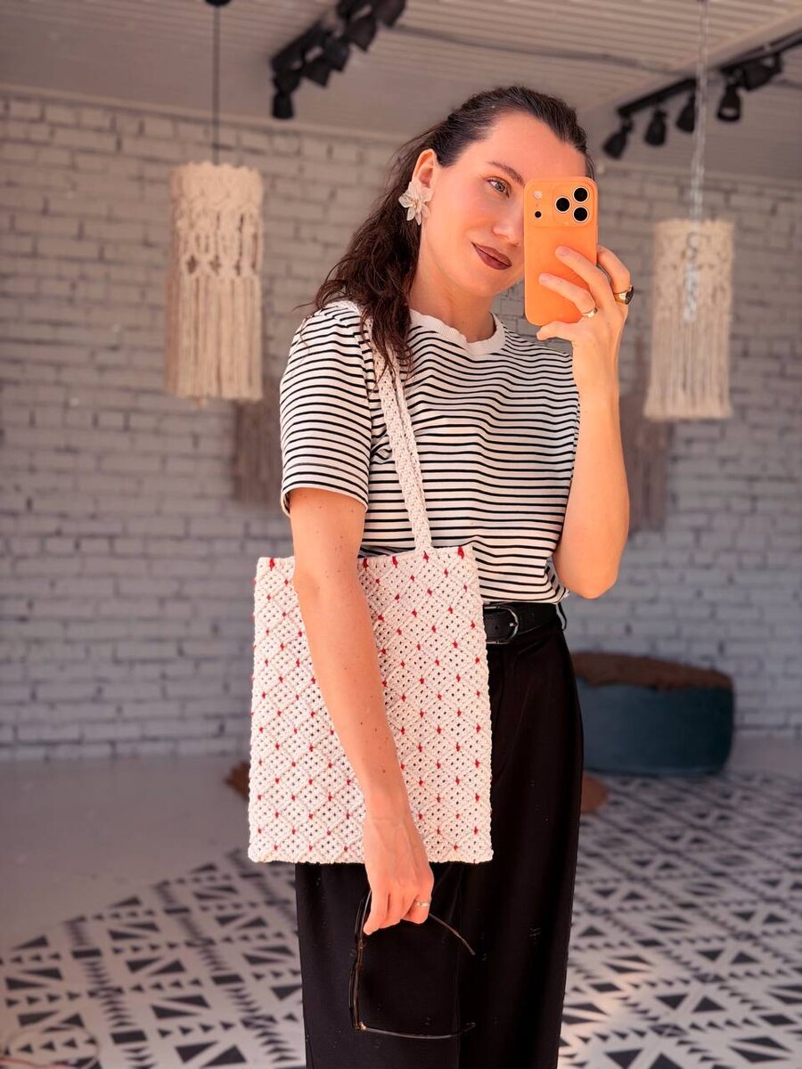 🤩🤩 🤩🤩Шопер Вот такой ❤️нежный ❤️легкий ❤️эффектный ❤️практичный получился шопер. И в пир, и в мир! Мне почему-то хочется назвать его «Земляника», наверное ассоциация из-за маленьких красных акцентов Как вам? #приветизмастерской TEXSENSE макраме: идеи и творчество