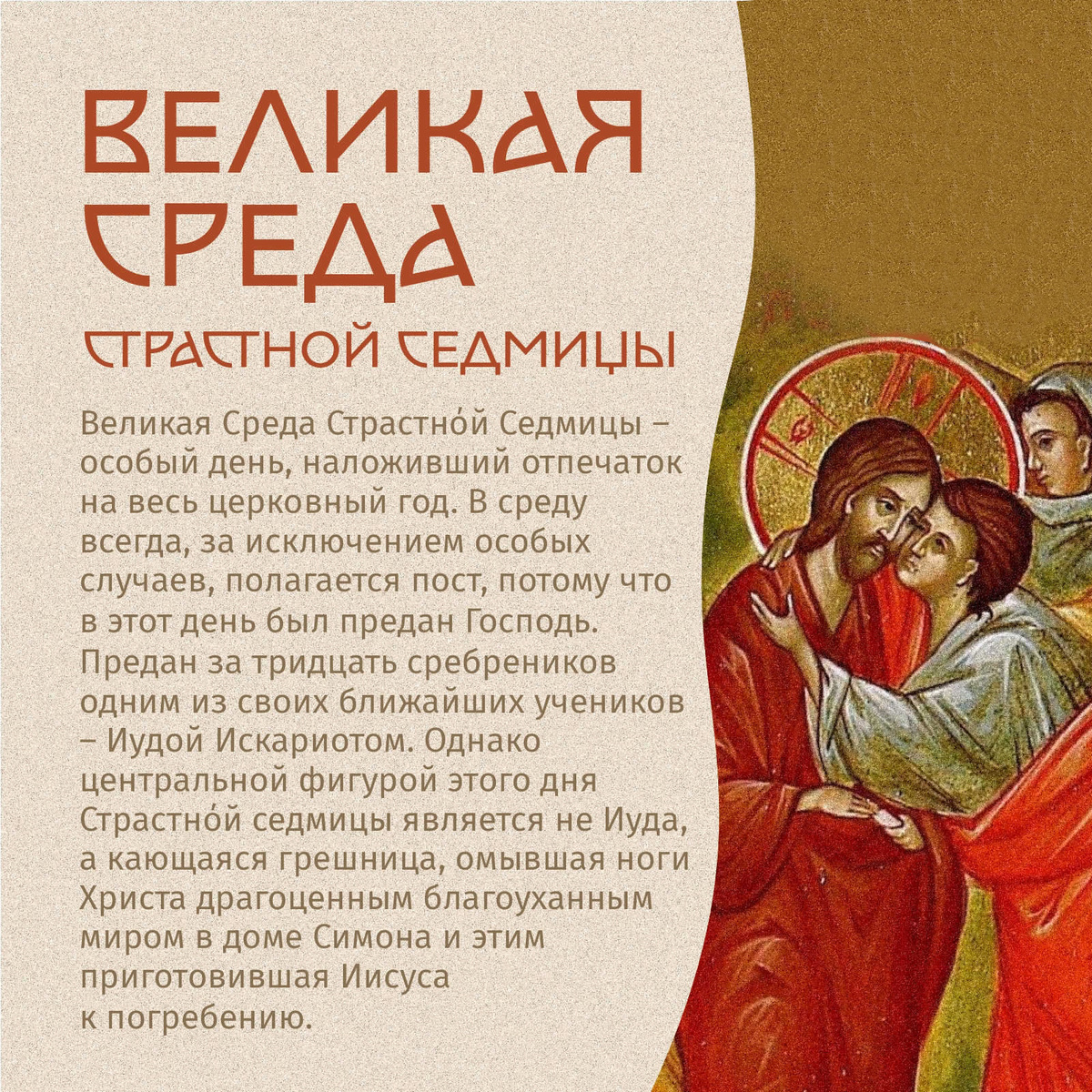 Великая Среда Страстнόй Седмицы – особый день, наложивший отпечаток на весь церковный год. В среду всегда, за исключением особых случаев, полагается пост, потому что в этот день был предан Господь. Подробнее рассказали в карточках: