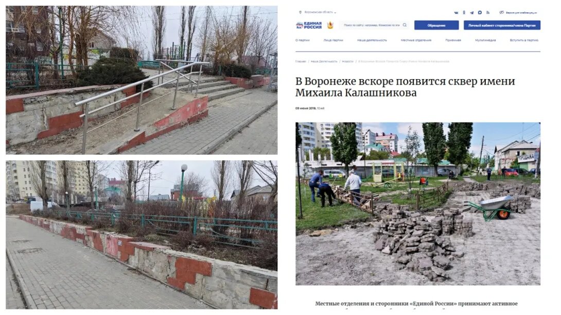 Воронежцы бьют тревогу из-за сквера имени легендарного конструктора стрелкового оружия Михаила Калашникова, который расположен 20-летия Октября в Ленинском районе. По словам горожан, зеленая территория находится в глубоком упадке. - Займитесь, наконец, сквером и площадкой. Детское и спортивное оборудование разваливается на глазах. Пандус для колясок разбит, а разросшиеся кусты нависают над проходом, - цитирует горожан «Труд Черноземья». Воронежцы обратили внимание на осыпающуюся облицовку, печальное состояние зелени, скамеек и спортивного оборудования. Редакция 36ON в свою очередь обратила внимание на интересный факт. В 2018 году воронежское отделение «Единой России» рьяно пиарилось на теме создания сквера Калашникова по линии партийной программы «Городская среда» (её объем в регионе оценивали в 606 млн рублей). Тогда воронежские единороссы рассказывали, что сторонники партии лично принимали активное участие в благоустройстве сквера имени прославленного конструктора. Но не прошло и 10