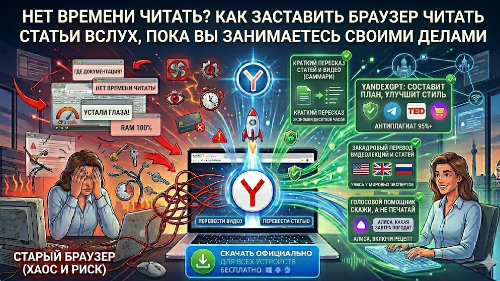 А что, если бы статьи можно было слушать, как любимые подкасты или аудиокниги? Больше не нужно устанавливать сторонние программы-читалки с механическими голосами роботов. Мы рекомендуем бесплатно скачать актуальную версию Яндекс Браузера по официальной ссылке. В него уже встроены потрясающие инструменты, которые полностью изменят ваш подход к потреблению текстового контента. Представьте: вы нашли классную статью про инвестиции или историю создания любимого фильма, но вам нужно идти готовить ужин или собираться на работу. В Яндекс Браузере достаточно нажать одну кнопку с иконкой наушников в адресной строке (или попросить голосового помощника: «Алиса, прочитай страницу»). Браузер тут же начнет выразительно читать текст вслух. Это не монотонный синтезатор речи из нулевых: нейросети Яндекса наделили Алису живыми интонациями, правильными ударениями и способностью делать смысловые паузы. Вы можете заниматься своими делами, слушая статью фоном. Если вы все-таки предпочитаете читать глазами, в