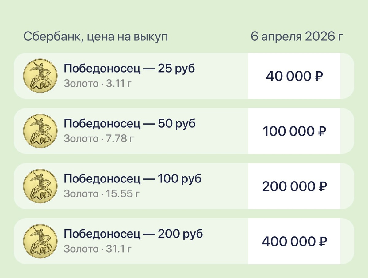 Интересно, что в феврале такая цена выкупа была установлена Сбербанком (и держалась продолжительное время) при более высоких биржевых ценах на золото. Видимо, в Сбербанке очень любят круглые цифры. Биржевые котировки: Золото: 11 875 ₽ +1.5% Cеребро: 187 ₽ Котировки монет: 👉 https://t.me/GdeMonetaBot/start