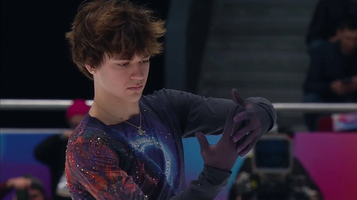Илья Строганов. (Россия) 4Л+3Т - галка на лутце. 4Р - чисто. 3А - падение. Видно, как после проката фигурист корит себя за падение. Хорошая дорожка шагов.
